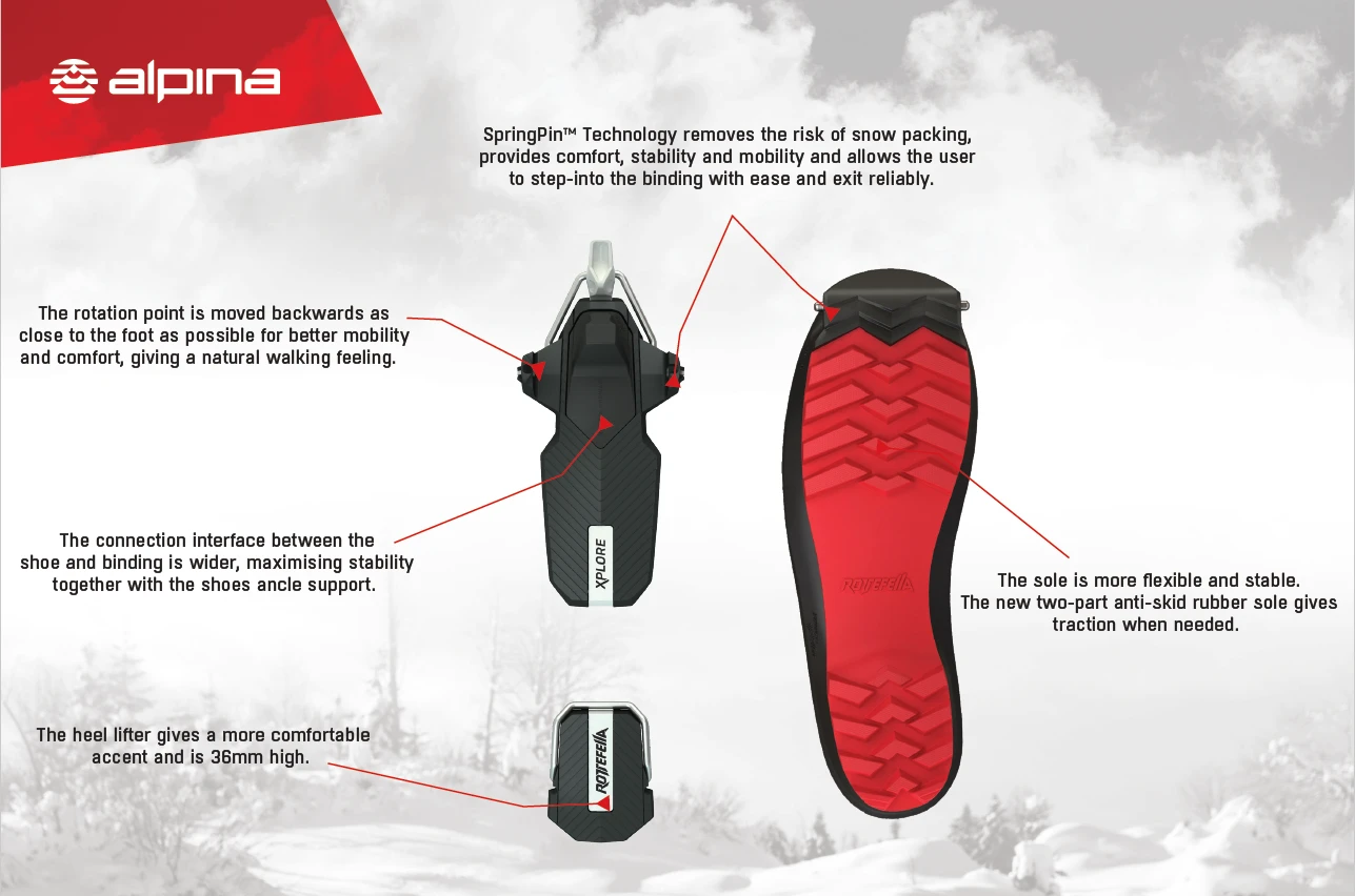Techniquement, ce modèle XP reprend les caractéristiques de l’Alpina Alaska 75mm et NNN BC, mais est dotée de la nouvelle semelle Xplore offrant un excellent déroulé de pied et un contrôle optimal des skis. Ces chaussures ont été conçues pour s’adapter et répondre au cahier des charges des nouvelles fixations Rottefella Xplore. Concrètement, le norvégien Rottefella a demandé au Slovène Alpina de proposer une nouvelle chaussure avec le système d’enclenchement/déclenchement rapide SpringPin. Il s’agit d’une technologie de deux picots situés sur le devant du pied qui viennent se fixer sur la fixation Rottefella Xplore. Ces « Pin » à ressorts sont situés sur les 2 côtés de la chaussure.