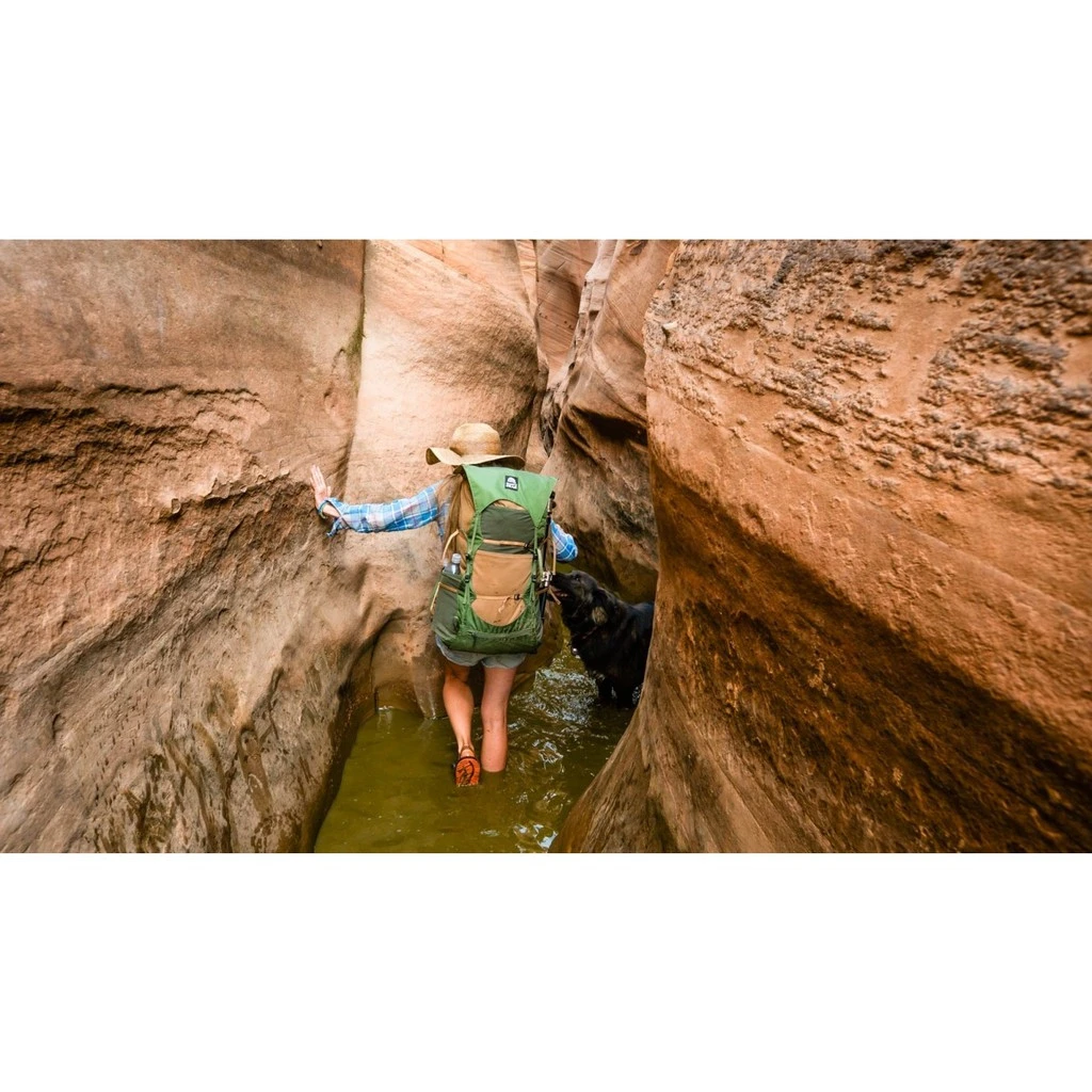 Le rabat supérieur et le rabat inférieur disposent d’une poche zippée de rangement. Deux poches mesh sont situées sur les côtés et deux à l’avant du sac à dos. Le rabat inférieur permet de fixer rapidement et efficacement un matelas en mousse ou une tente. De nombreuses sangles de compression latérales sécurisent le contenu du sac.